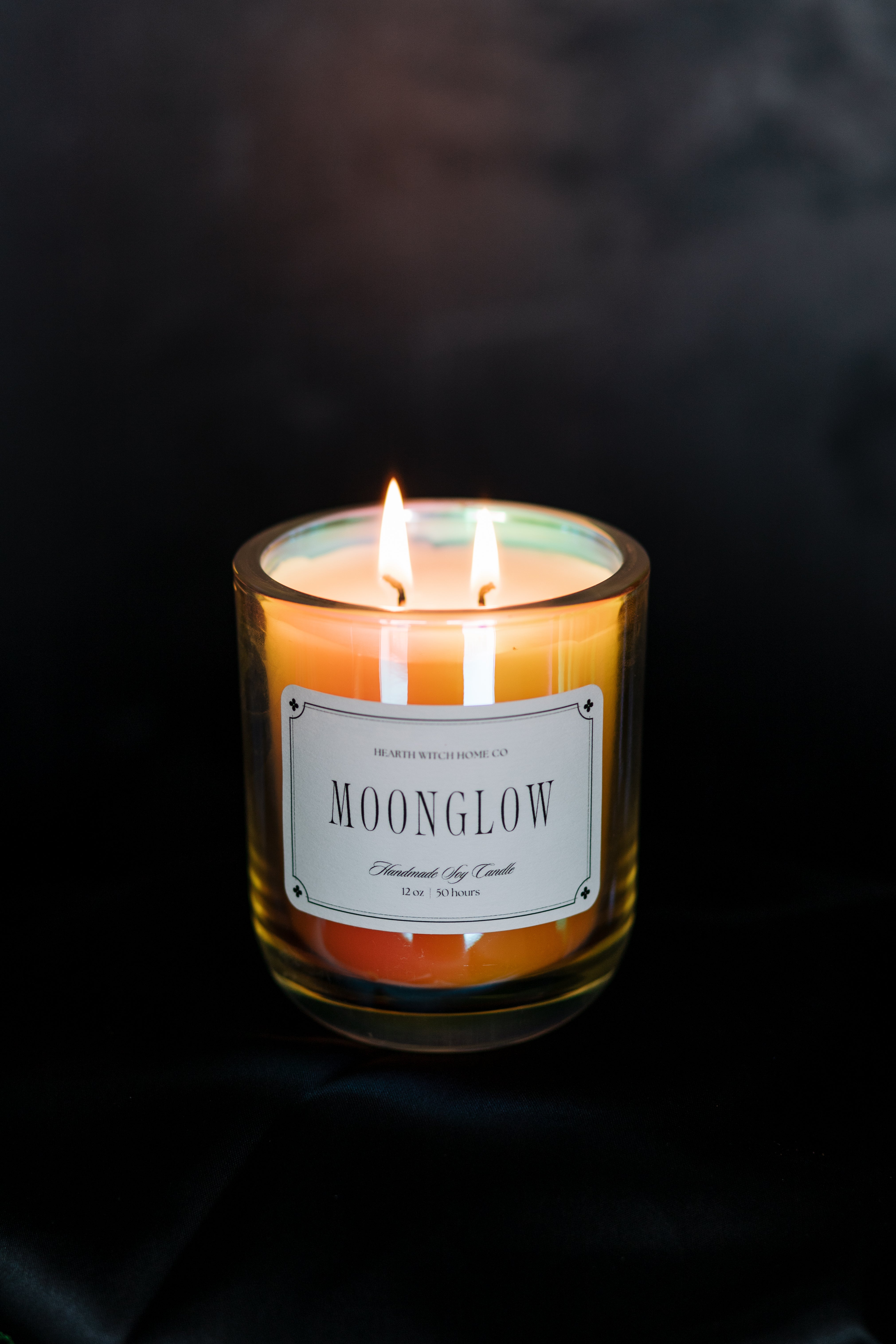 Moonglow is poured into an iridescent jar that shimmers like the surface of the moon, casting a gentle glow across any space it touches.